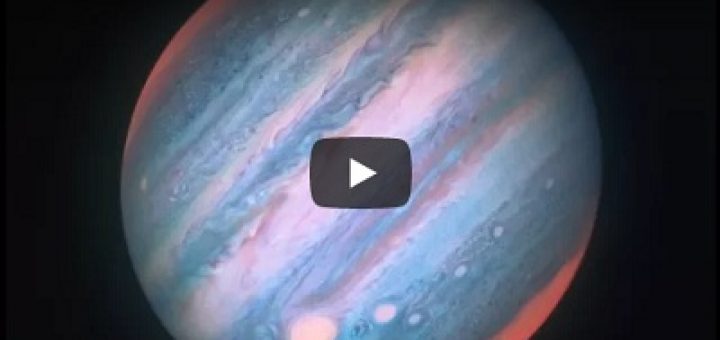 The following video shows a magnificent image of Jupiter taken by Hubble Space Telescope in ultraviolet and infrared technique.